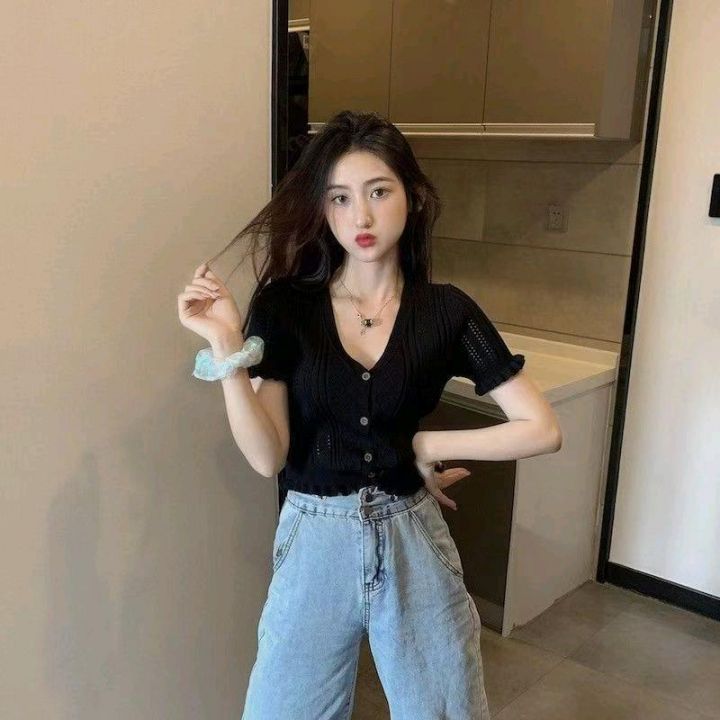 夏季新款网红净版复古设计款韩版V领冰丝针织小衫,独立包装,均码面料柔软...