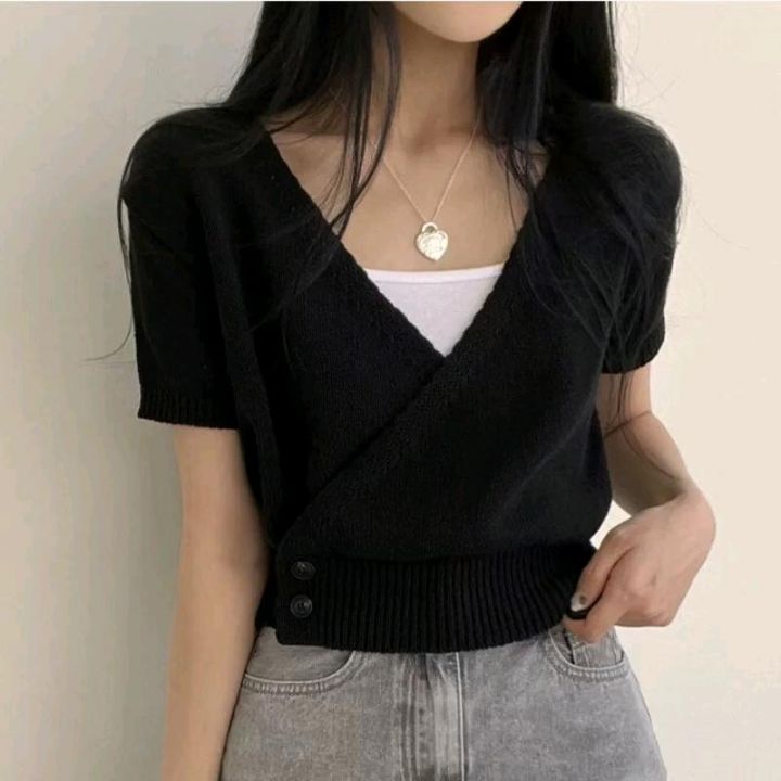 夏季新款法式小众设计感斜襟V领气质两粒扣收腰针织短袖T桖,独立包装,均码...