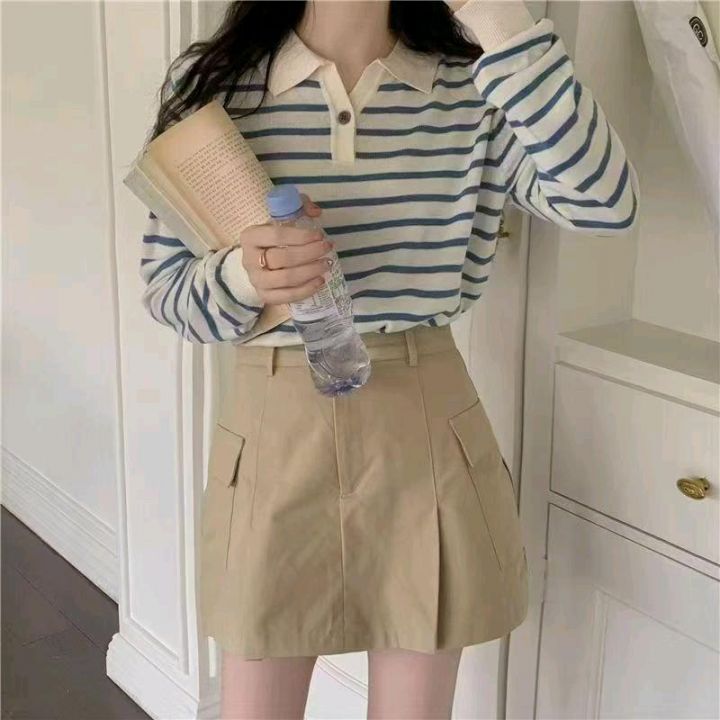 早秋新款韩系宽松高级感撞色条纹百搭POLO领长袖针织毛衣,独立包装,均码面...