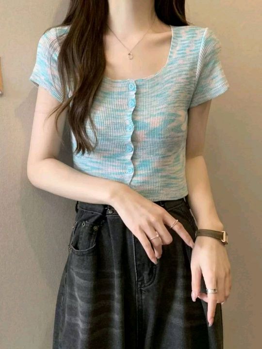 夏季新款段染彩纱木耳边性感辣妹针织短袖t恤,独立包装,均码面料柔软舒适...