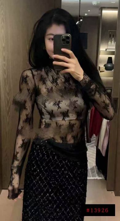 350件半高领蕾丝网纱打底衫女叠穿内搭透视薄纱独特别致上衣高级感薄,水溶...
