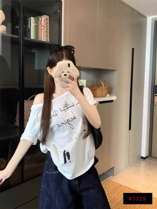 [月亮]:6.9清542件/分货7.5[月亮]:夏季新款涂鸦印花露肩设计纯棉辣妹上衣...