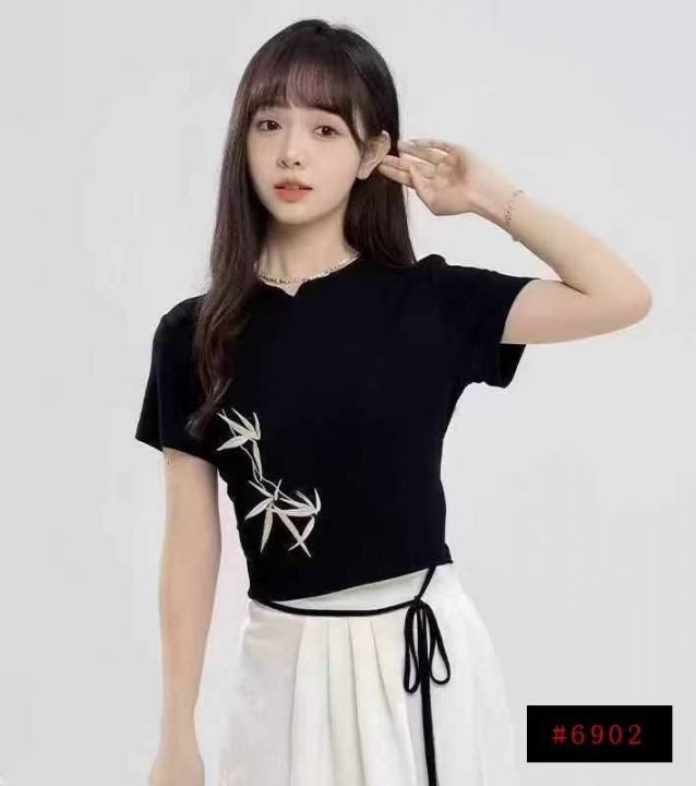 [月亮]:6.8秒杀清190件(不分货)[月亮]:新中式刺绣绑带设计辣妹包边T恤[...