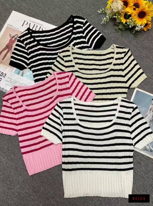夏季新款撞色条纹甜美方领设计感短袖针织T桖,独立包装,均码面料柔软舒适...