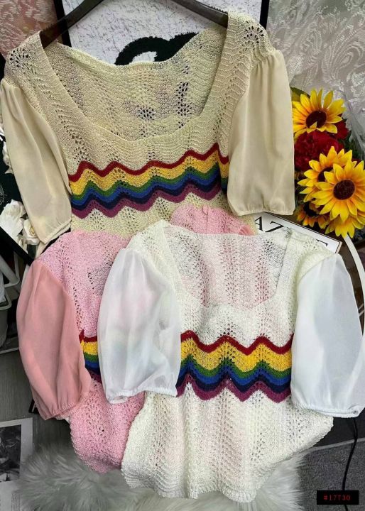 夏季新款镂空撞色彩虹雪纺拼接泡泡袖冰丝的短袖针织衫,独立包装,均码面料...
