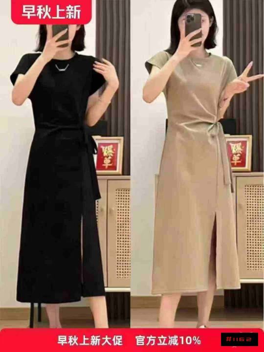 大码弹力设计感绑带T恤裙女夏季法式气质通勤显瘦小众收腰开叉连衣裙5000件...