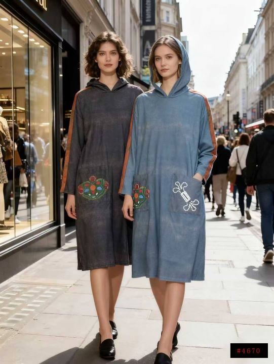6.8清电商仓回收1003件仿牛仔复古小众慵懒风宽松胖MM连帽连衣裙,码数2-4-6...