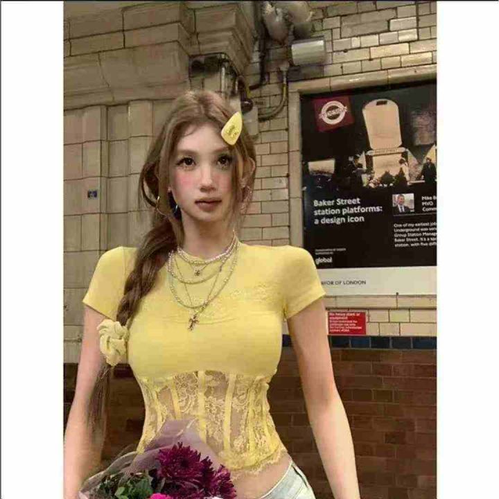 甜辣芭莉 蕾丝拼接短袖T恤女设计感辣妹性感纯欲修身显瘦短款上衣,独立包装...