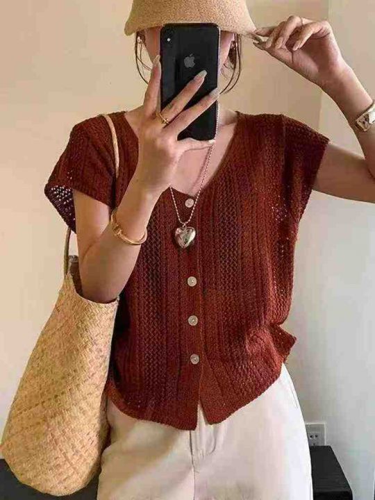 夏季新款法式纯色v领宽松镂空设计感单排扣洋气冰丝短袖时尚减龄针织开衫,...