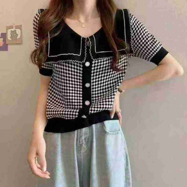 娃娃领套头上衣女夏季设计感短款冰丝减龄小香风针织短袖,独立包装,120件...