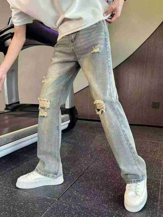 美式高街vibe破洞牛仔裤男夏季薄款潮牌痞帅炸街显高显瘦微喇裤子184条全清1...