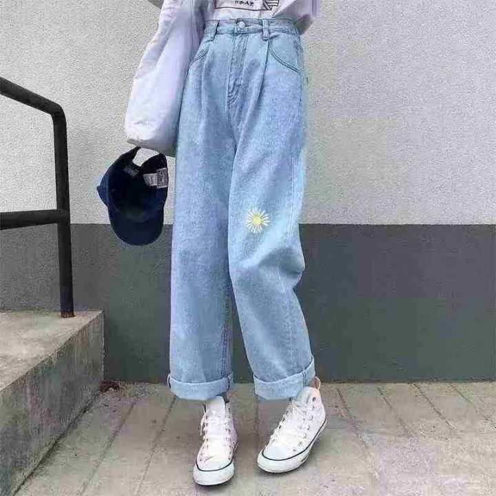 男女同款小雏菊刺绣牛仔裤子直筒阔腿萝卜宽松休闲高腰显瘦百搭牛仔裤1400件...