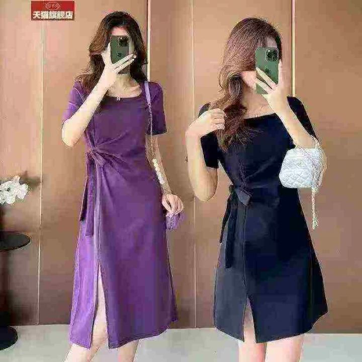 大码弹力设计感绑带T恤裙女夏季法式气质通勤显瘦小众收腰开叉连衣裙5000件...