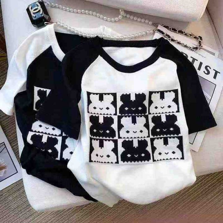 夏季新款韩系圆领撞色提花针织短袖T恤,独立包装,均码面料柔软舒适弹力大...