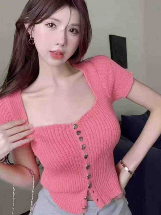 夏季新款纯欲甜辣妹设计感小众短款性感锁骨别致方领针织短袖开衫,独立包装...