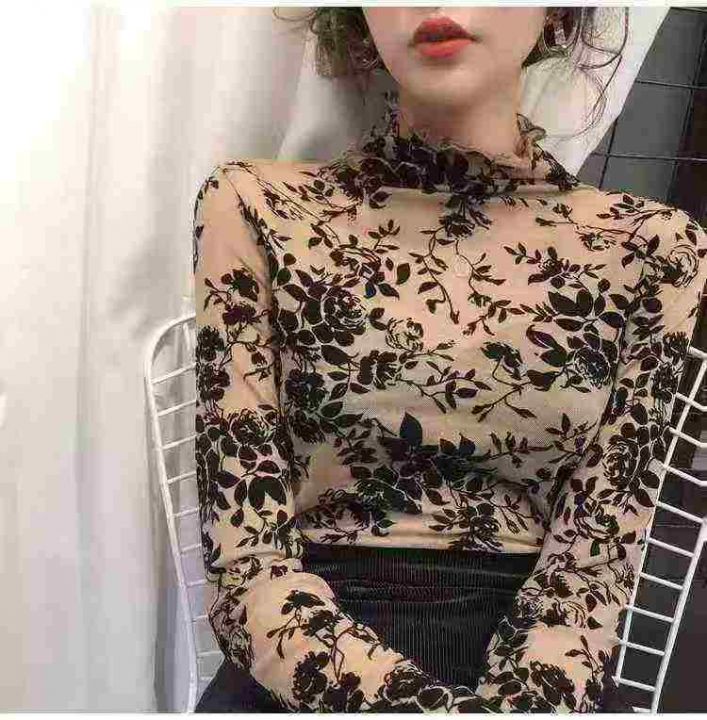 5.8清294件春秋植绒碎花半高领蕾丝打底衫女性感木耳边网纱内搭纱衣 码数S-2...