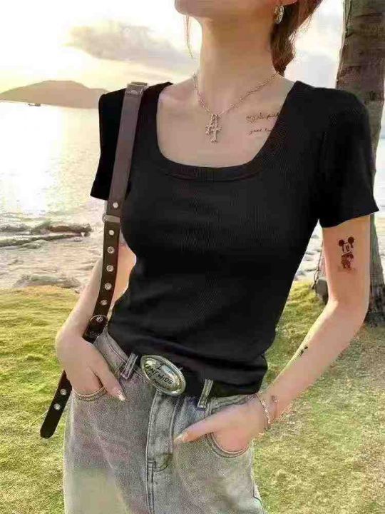 [月亮]:5.5清950件[月亮]:简约时尚方领锁骨短袖T恤[月亮]:M-XXXL(高弹...