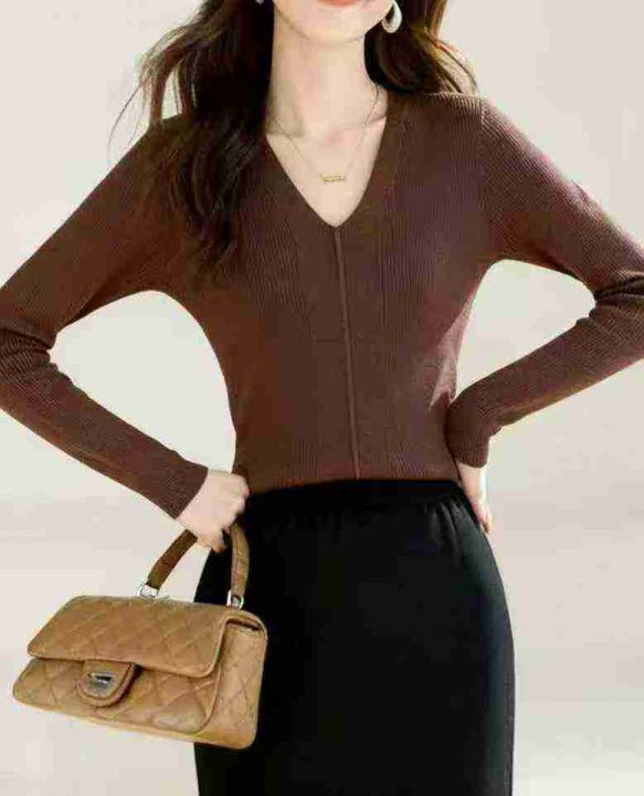 秋冬新款法式V领弹力修身高级显瘦气质打底通勤包芯纱长袖毛衣,独立包装,...