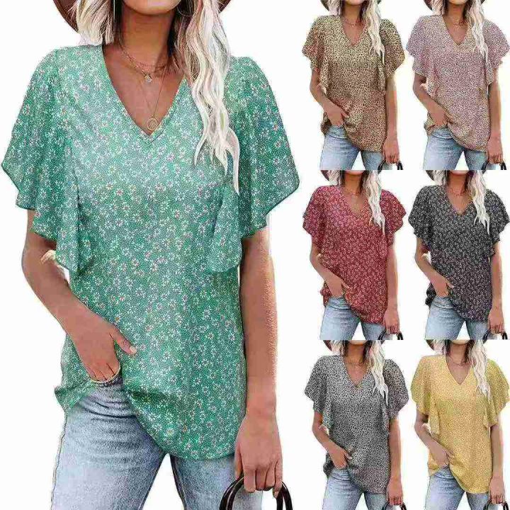 [爆竹][爆竹]3.9清700件欧美时尚休闲V领印花荷叶边袖口短袖,整款,花型图...