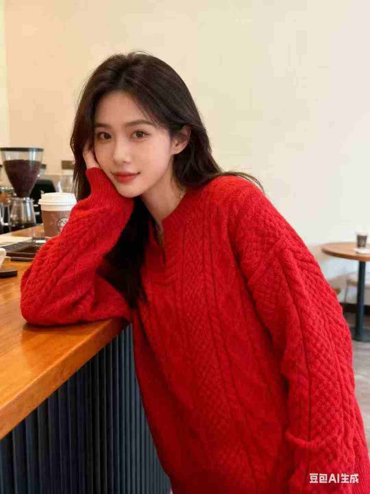 全清10.9,本命年女装V领麻花中长款套头毛衣女秋冬慵懒风宽松红色...