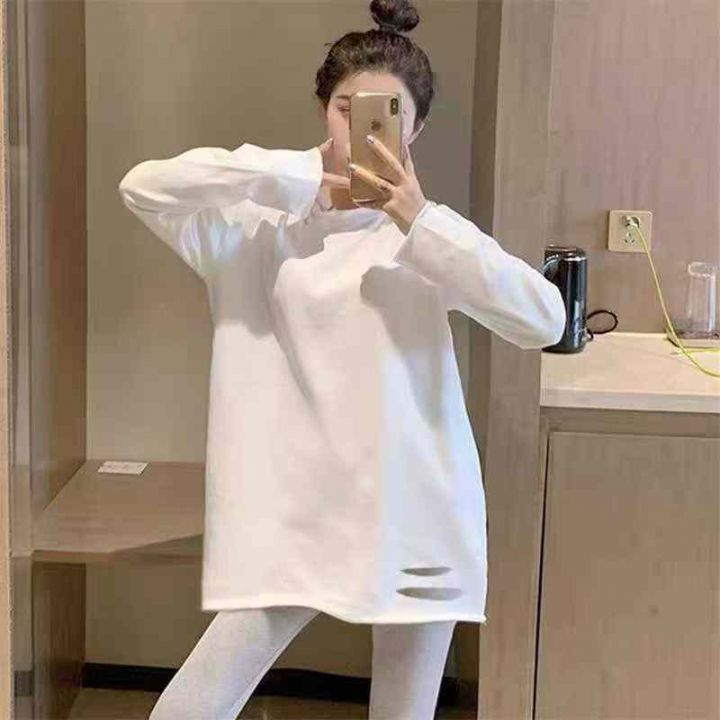 4.5清天猫仓回收3500件秋冬新款纯棉加婴儿绒设计感破洞长袖T恤杉,码数S-2X...