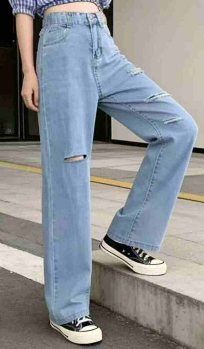 春夏季新款品牌原单宽松半松紧腰破洞设计款直筒阔腿牛仔裤,独立包装带吊牌...