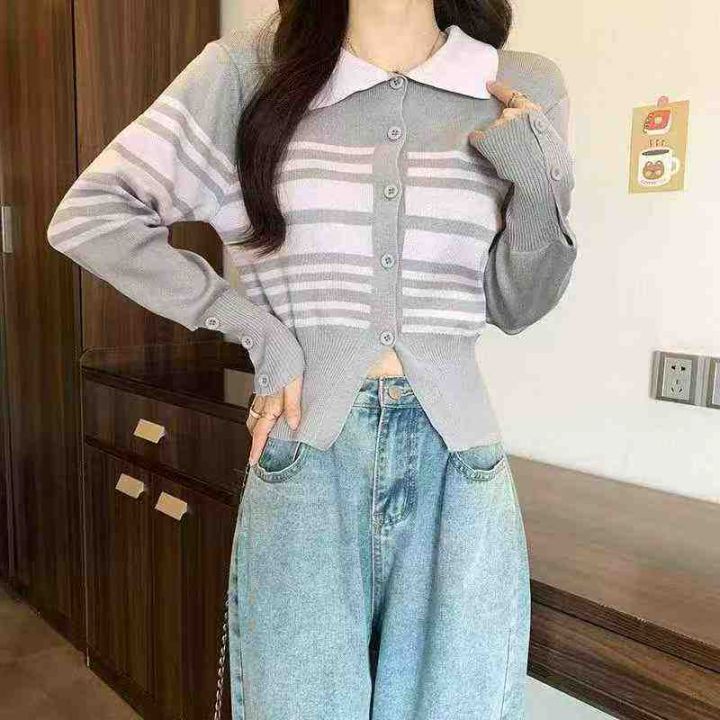 秋装新款设计感撞色洋气韩版polo领别致针织毛衣开衫,...