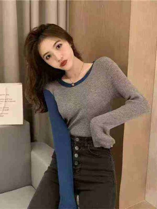 秋冬新款高弹力修身显瘦撞色设计感包芯纱打底长袖针织...