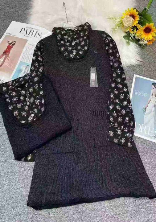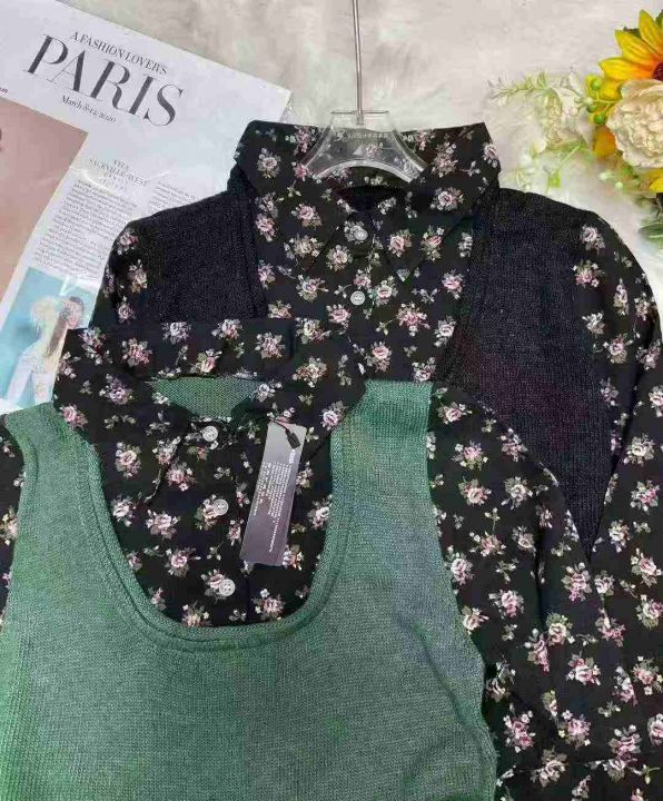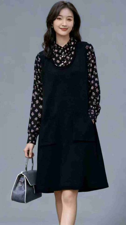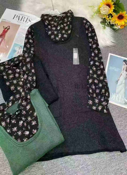 品牌原单秋冬复古通勤百搭碎花衬衣拼接毛衣连衣裙,独...
