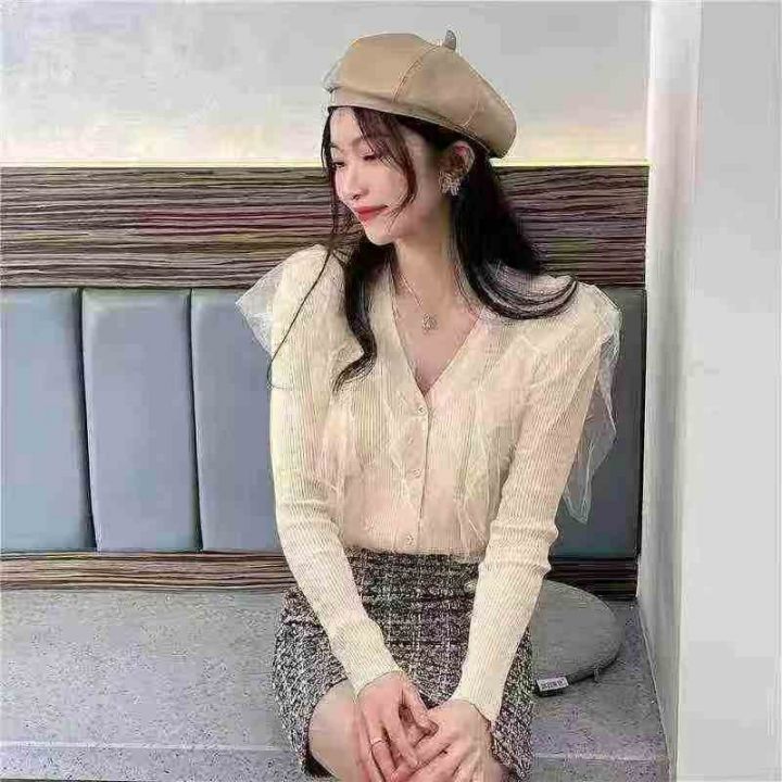 拼接网纱针织衫开衫修身显瘦网红靓妹毛衣打底小外套,...