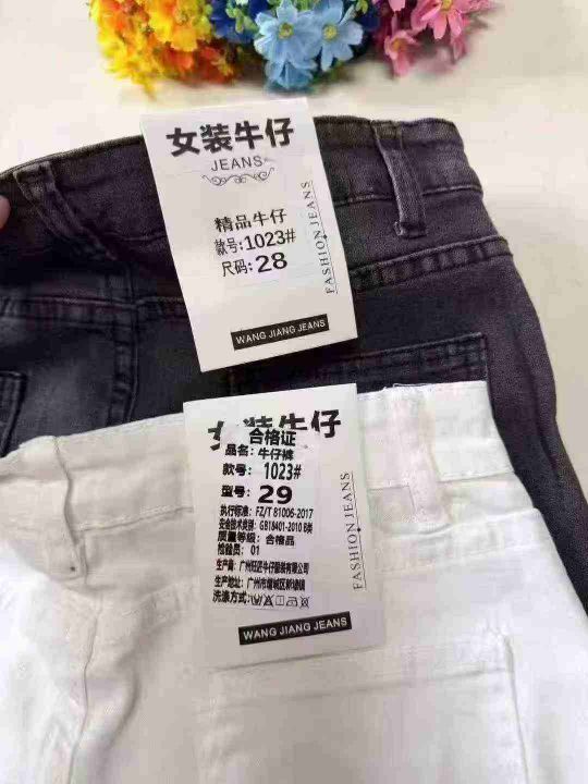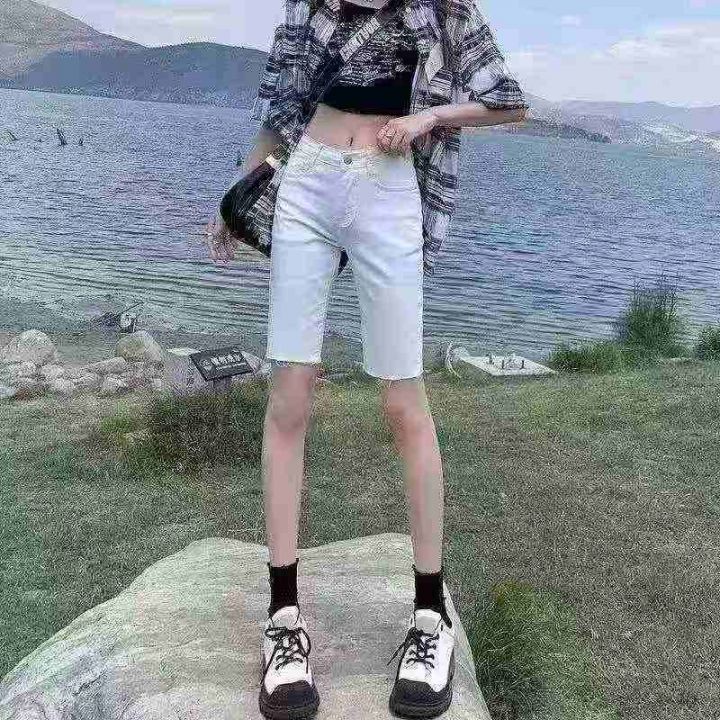 编号:1023#夏季显瘦百搭骑行网红弹力五分直筒毛边牛...