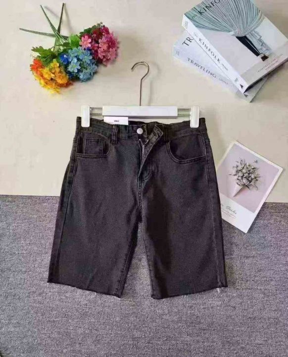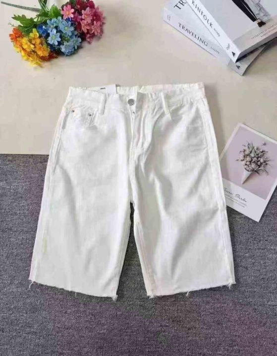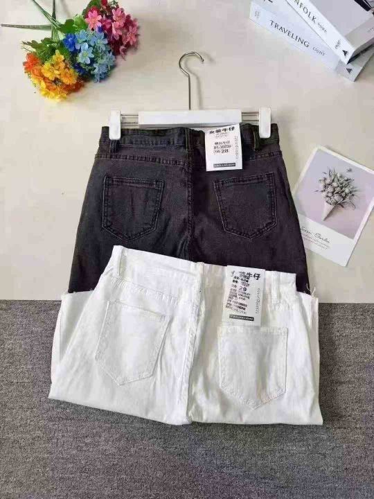 编号:1023#夏季显瘦百搭骑行网红弹力五分直筒毛边牛...