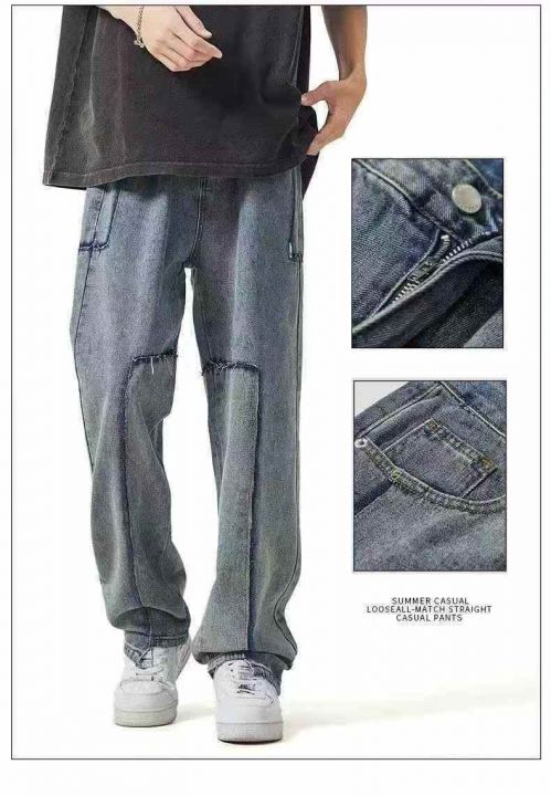 #男士牛仔裤批发 复古水洗男士直筒宽松美式潮牌拼接工...