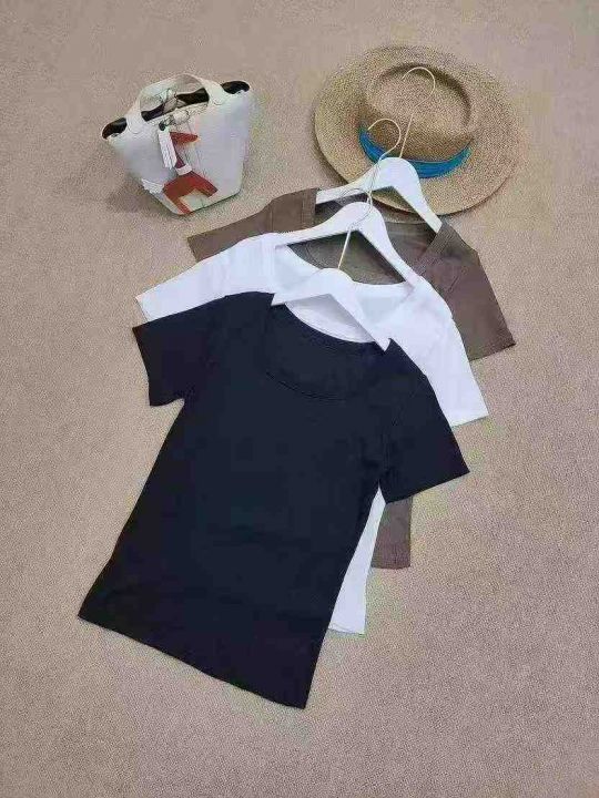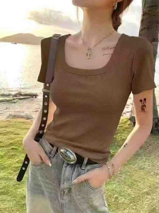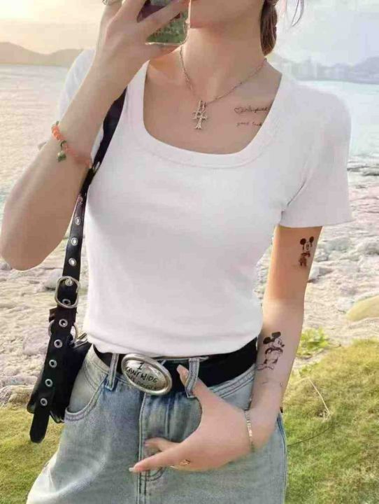 [月亮]:5.5清950件[月亮]:简约时尚方领锁骨短袖T恤[...