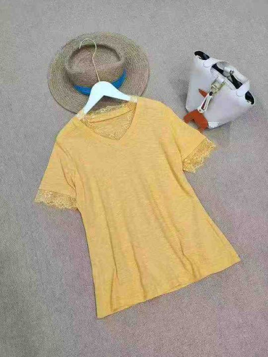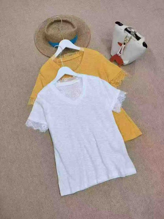 [月亮]:美式设计感蕾丝拼接休闲短袖