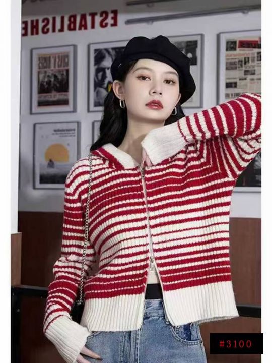 秋冬季新款弹力修身显瘦撞色条纹百搭双拉链针织毛衣开衫,独立包装,均码面...