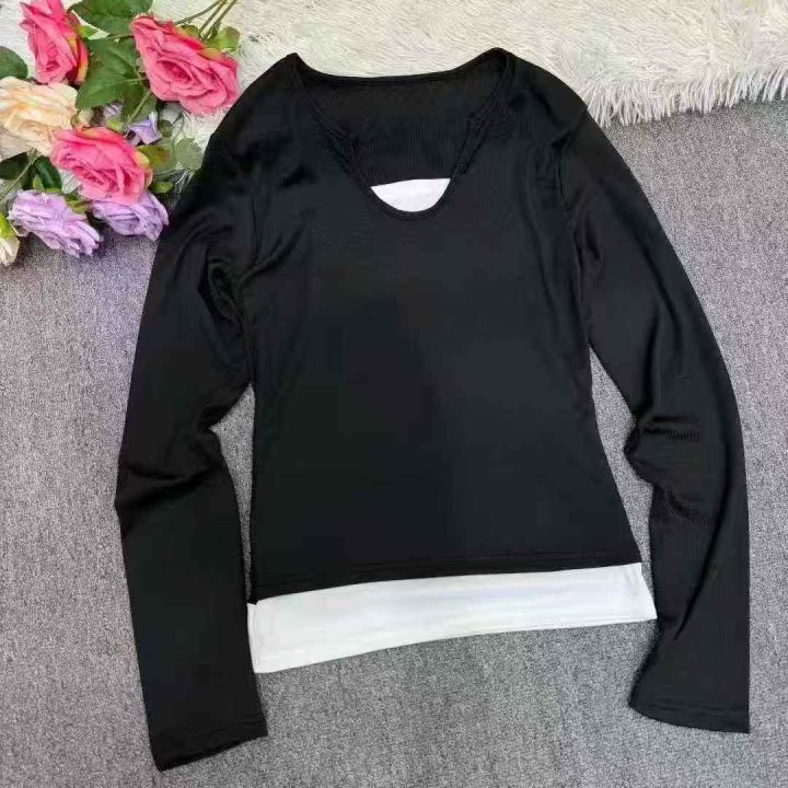 ️6180件\'美式甜辣妹韩版假两件长袖t恤女春夏修身打底衫撞色纯欲显瘦上衣,独立包装,码数M-2XL,全清5.8元\'分货➕0.5