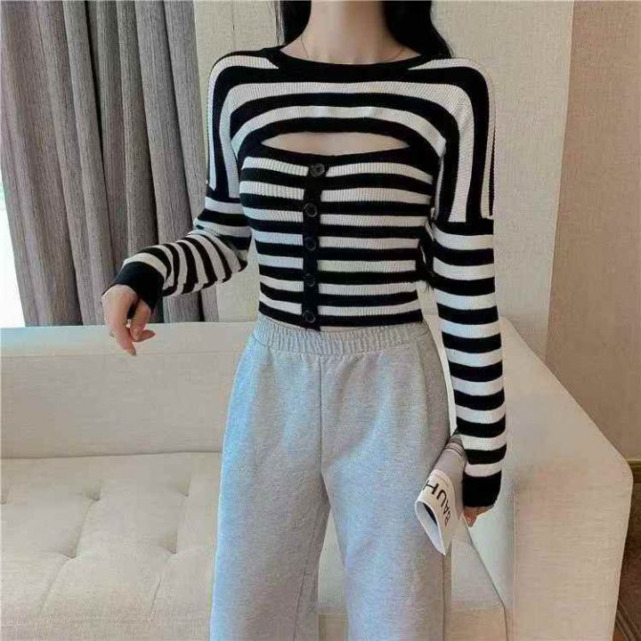 秋季新款撞色条纹软糯吊带背心+针织弹力修身上衣俩件...