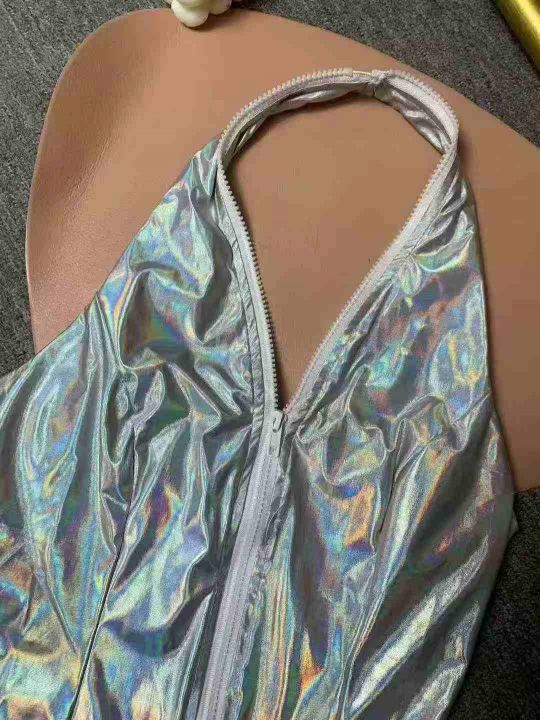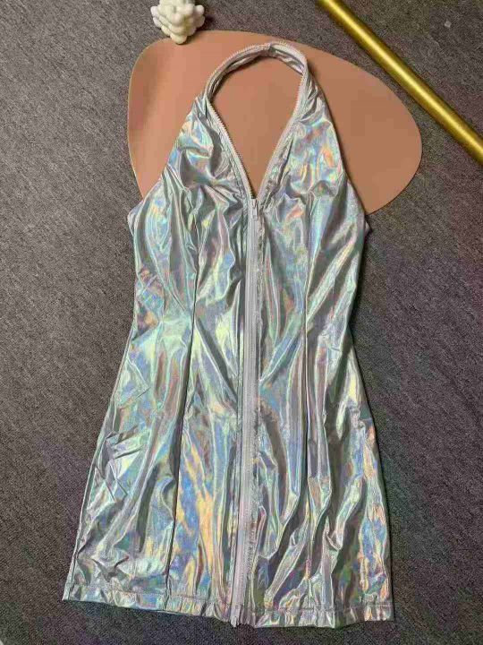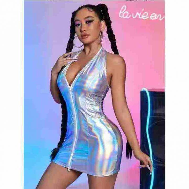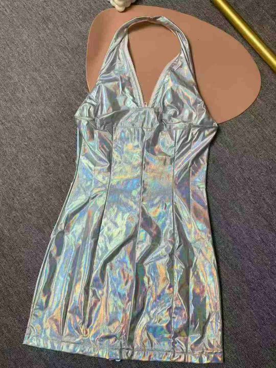 6.8清245件夜店摇滚风镭射炫彩前拉链挂脖性感辣妹高腰连衣包臀裙 码数XS- L 独立包装