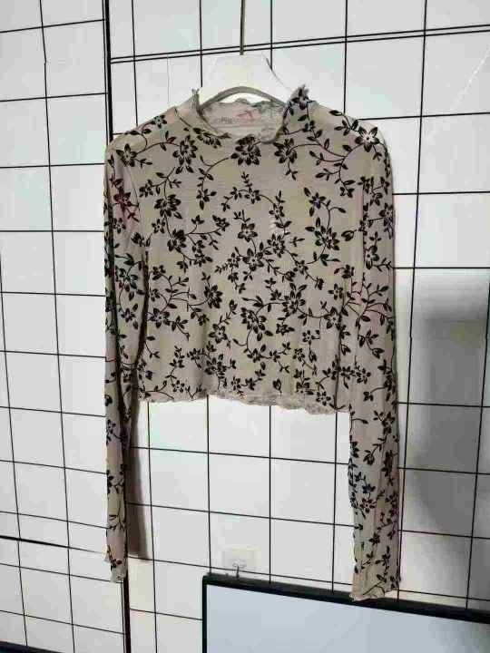 5.8清294件春秋植绒碎花半高领蕾丝打底衫女性感木耳边...