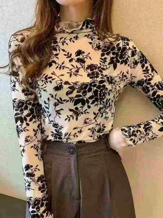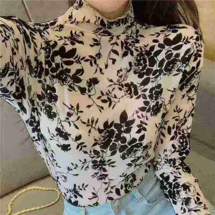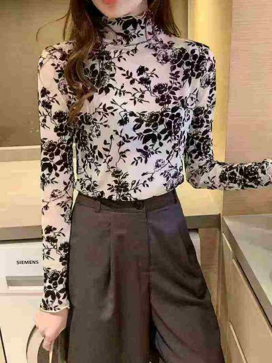 5.8清294件春秋植绒碎花半高领蕾丝打底衫女性感木耳边网纱内搭纱衣 码数S-2XL 独立包装