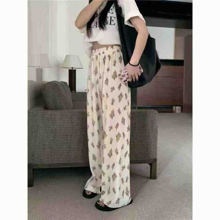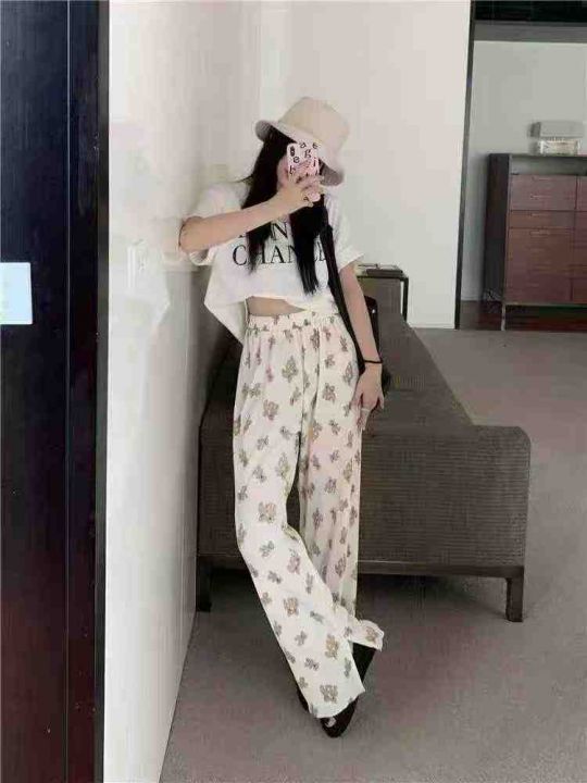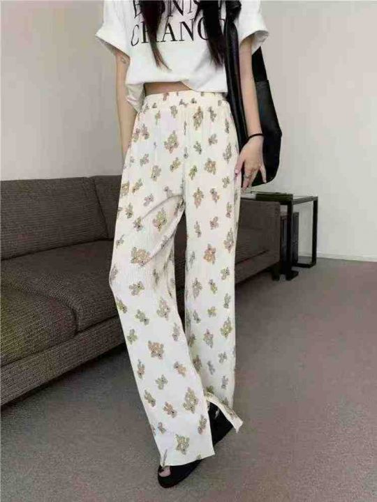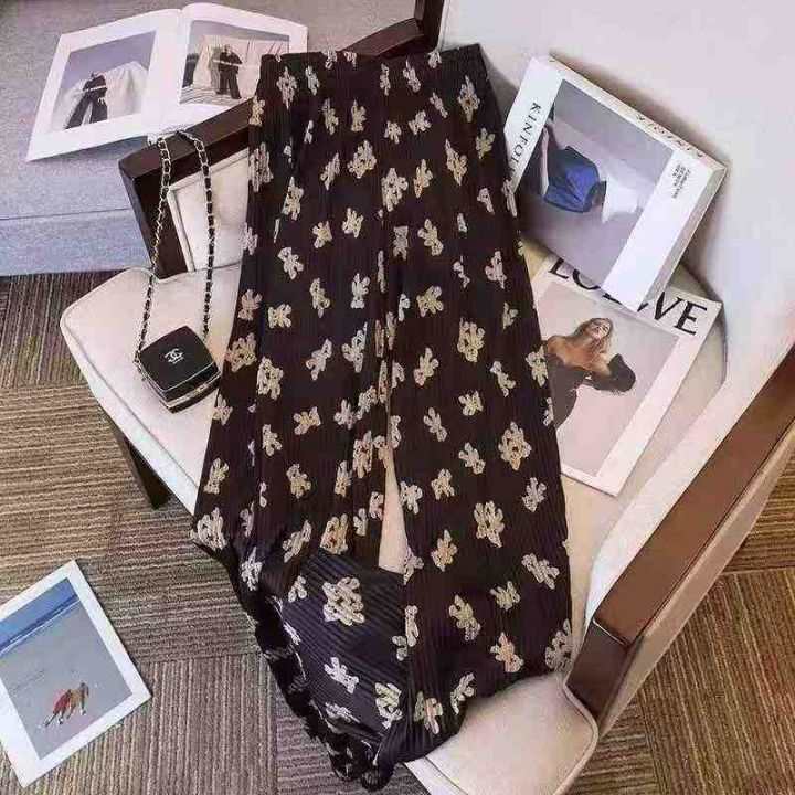 小熊印花风格百褶裤女宽松百搭垂感阔腿裤高腰直筒裤休...