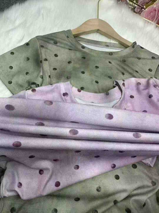 重工晕染波点圆领短袖T恤女夏季设计感显瘦遮肉气质上衣,整款2色,紫色为主,弹力超大,2到5码,3200件左右,4.9秒杀,分货加1