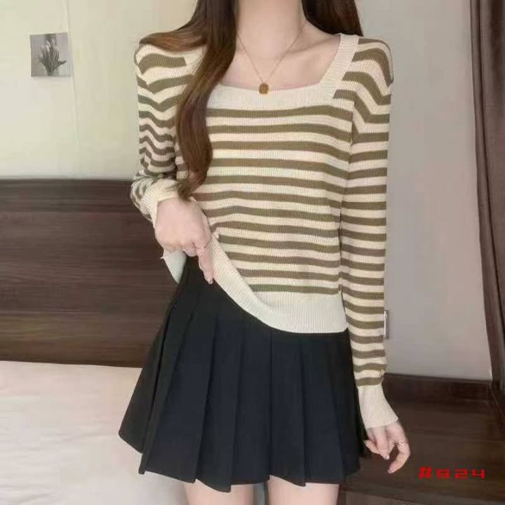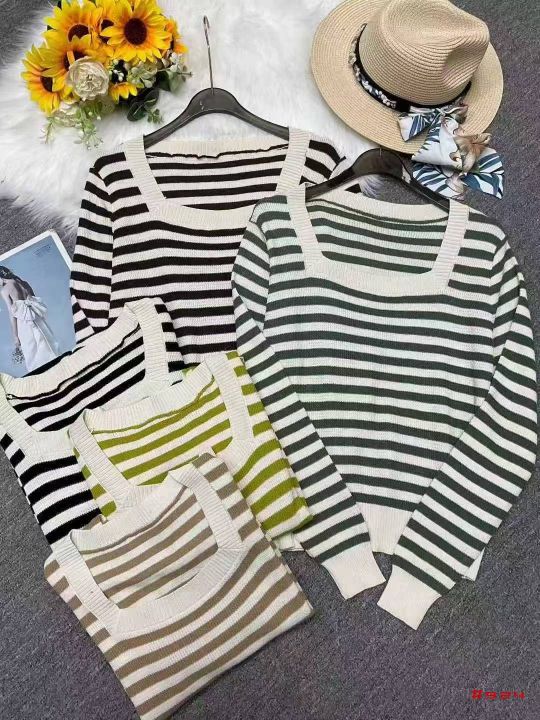 秋冬新款宽松撞色条纹针织方领套头毛衣,独立包装,均...