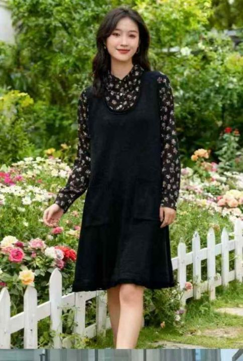 品牌原单秋冬复古通勤百搭碎花衬衣拼接毛衣连衣裙,独...