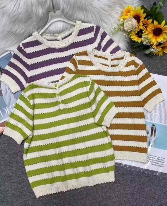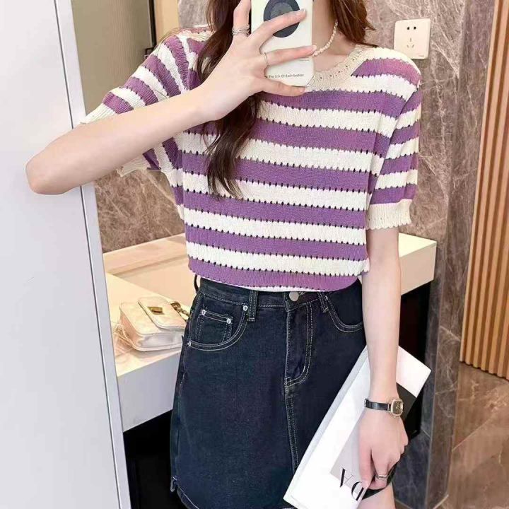 夏季新款港味风绝美撞色条纹圆领宽松正肩显瘦冰丝针织短袖,独立包装,均码面料柔软舒适,540件,全清5.9元超低价秒杀!分货加一!