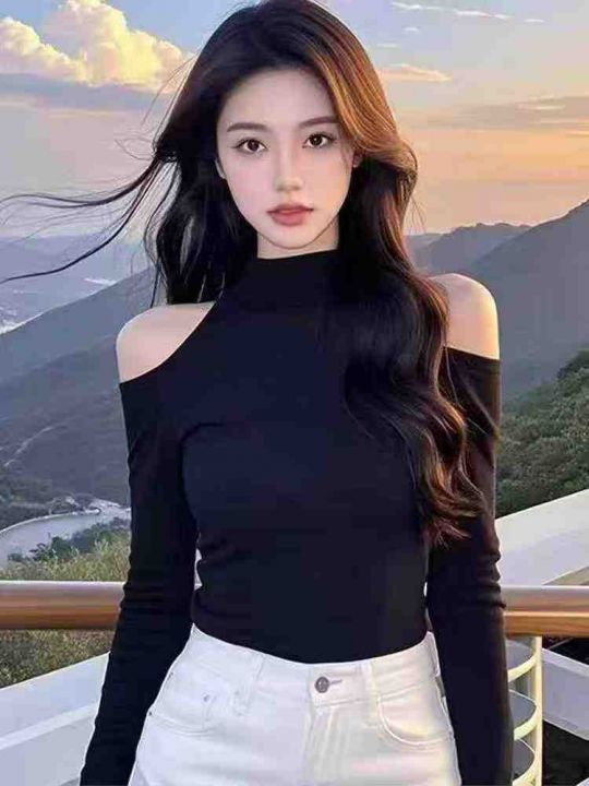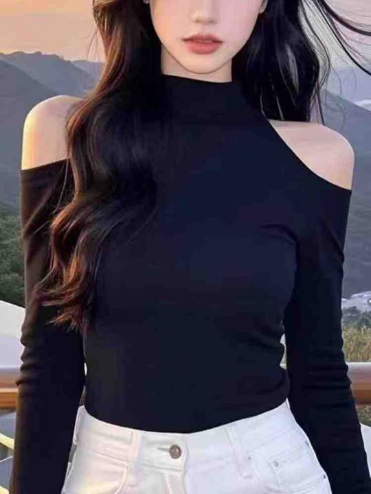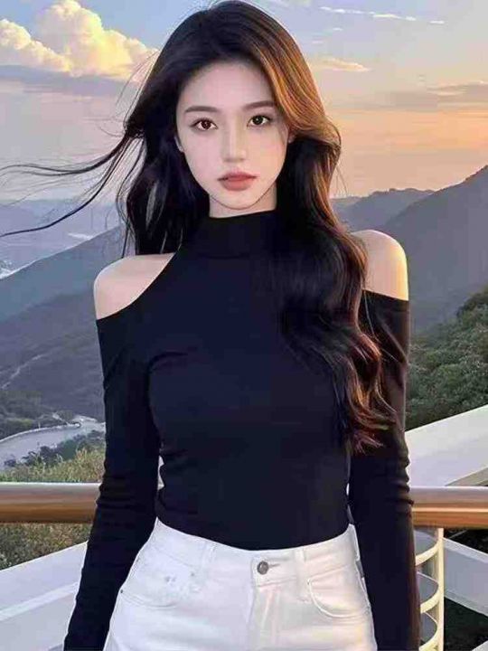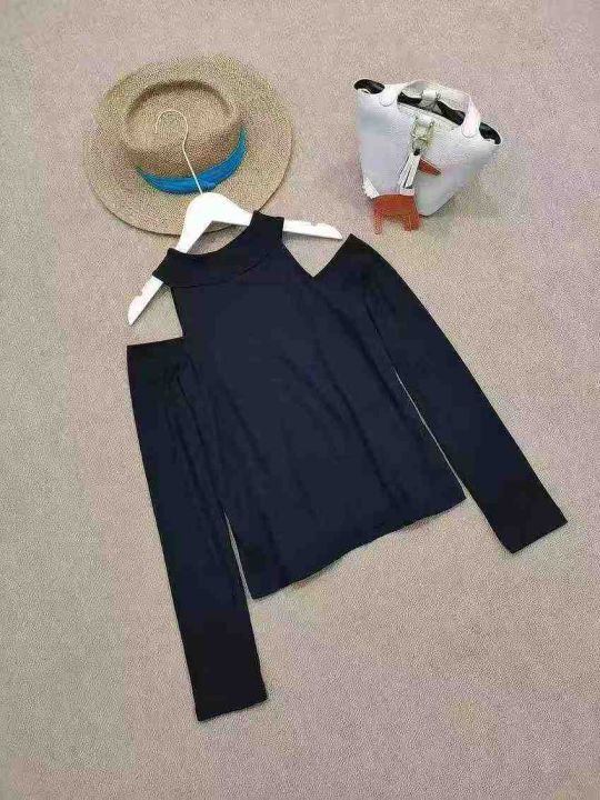 [月亮]:春秋纯欲性感立领露肩德绒上衣