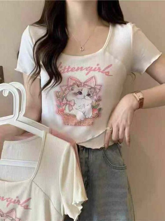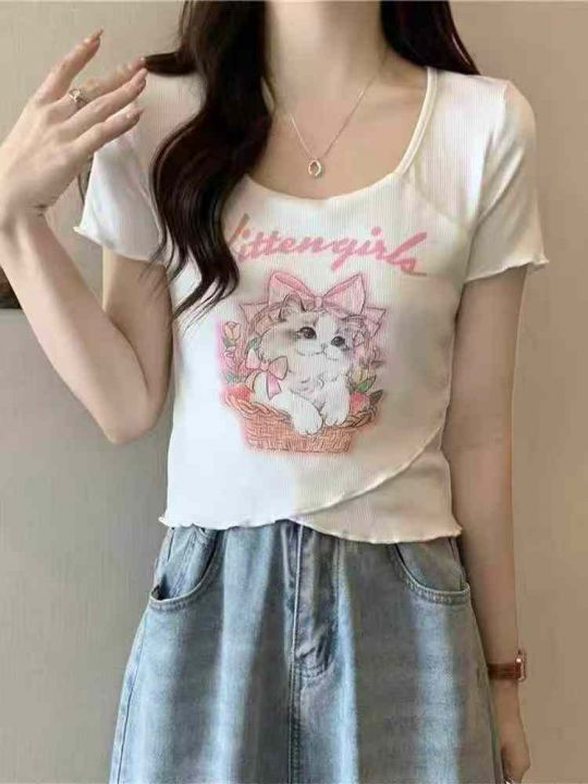[月亮]:不规则猫咪印花辣妹短袖T恤