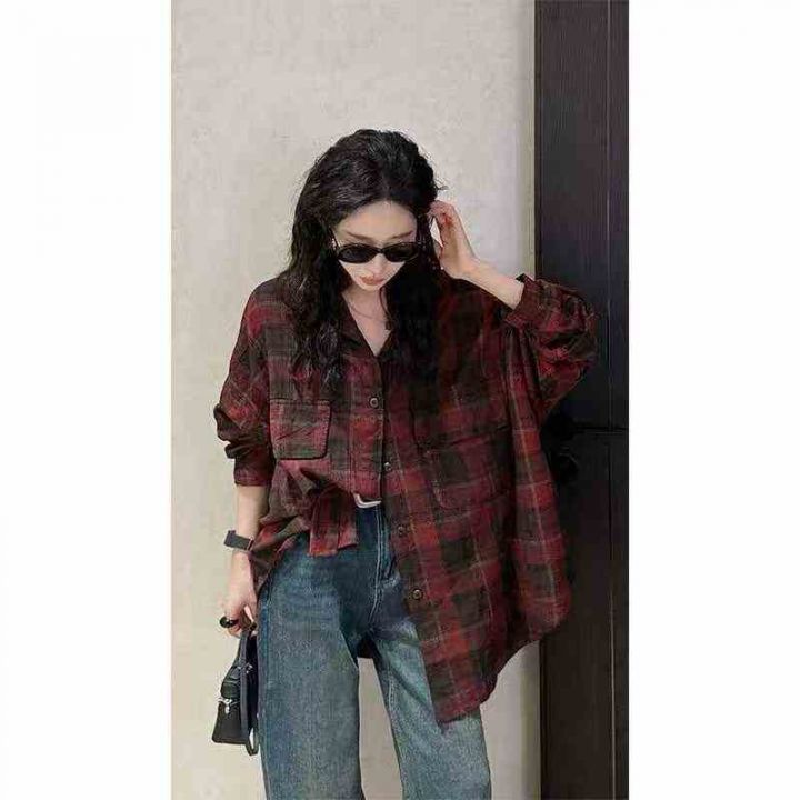 春秋美式复古新款格子慵懒衬宽松长袖休闲衬衣上衣开衫...