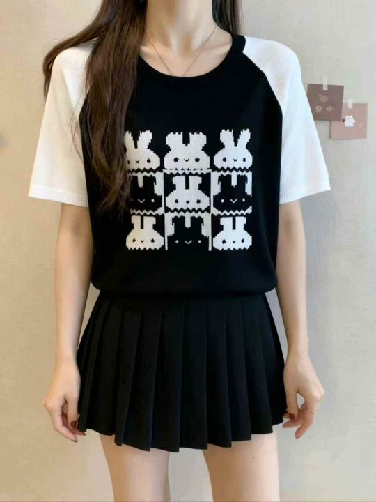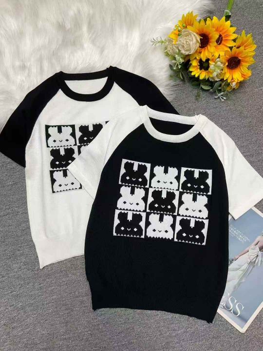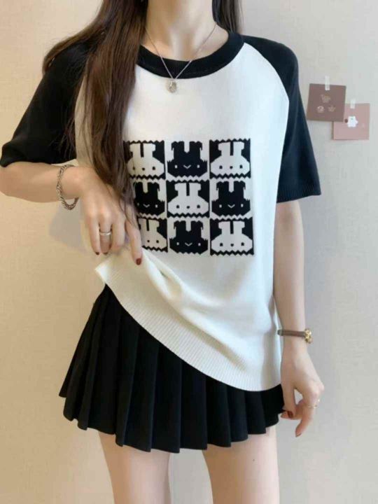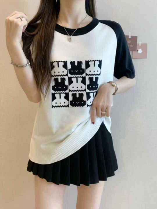 夏季新款韩系圆领撞色提花针织短袖T恤,独立包装,均...